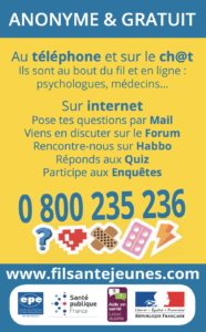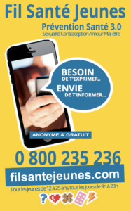 Tu as besoin de parler de ta santé, de questions en lien avec la sexualité, l’amour, le mal-être… dans l’anonymat, Fil santé jeune t’écoute, sans jugement. Ce service est entièrement anonyme et gratuit pour les 12-25 ans tous les jours de 9h à 22h.