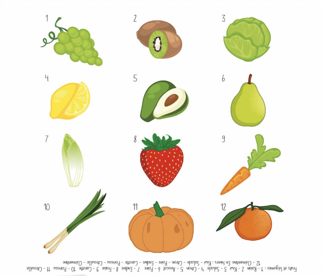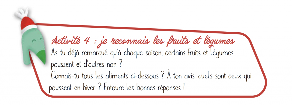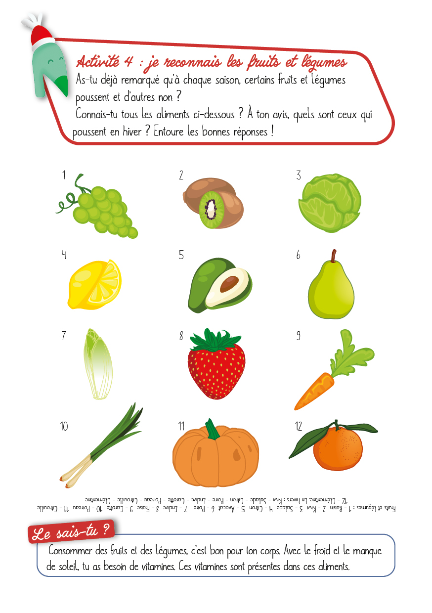 As-tu déjà remarqué qu’à chaque saison, certains fruits et légumes poussent et d’autres non ?Connais-tu tous les aliments ci-dessous ? À ton avis, quels sont ceux qui poussent en hiver ?Montre nous les bonnes réponses à l’écran ou entoure la bonne réponse si tu préfères imprimer cette activité !